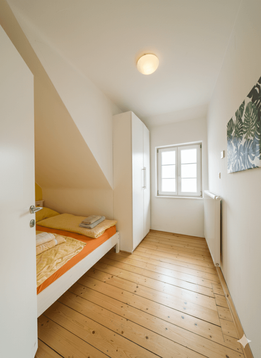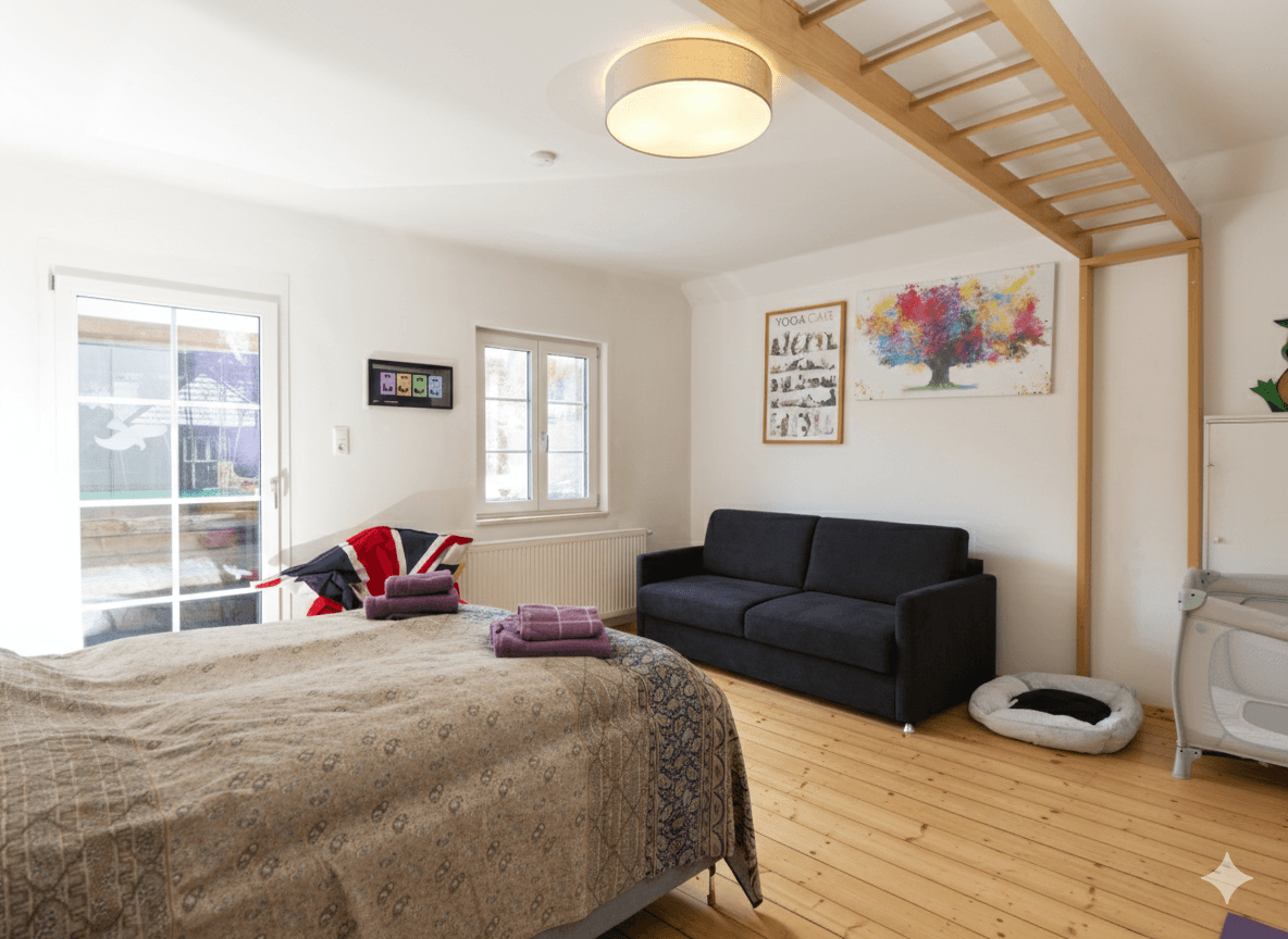Spacious master suite with king-size bed, east-facing balcony, and panoramic Alpine views. Perfect ambiance for relaxation after a day exploring Murau.