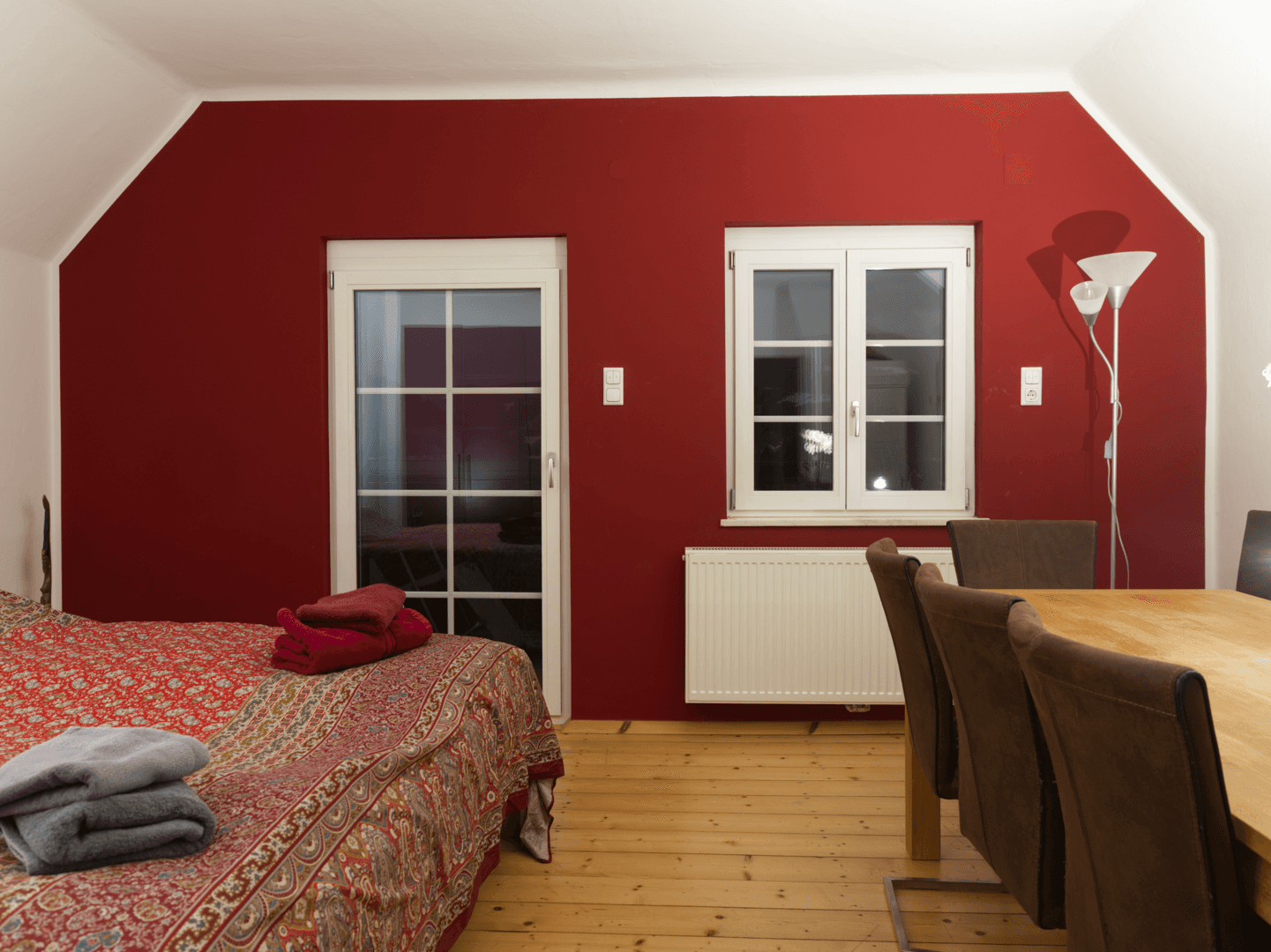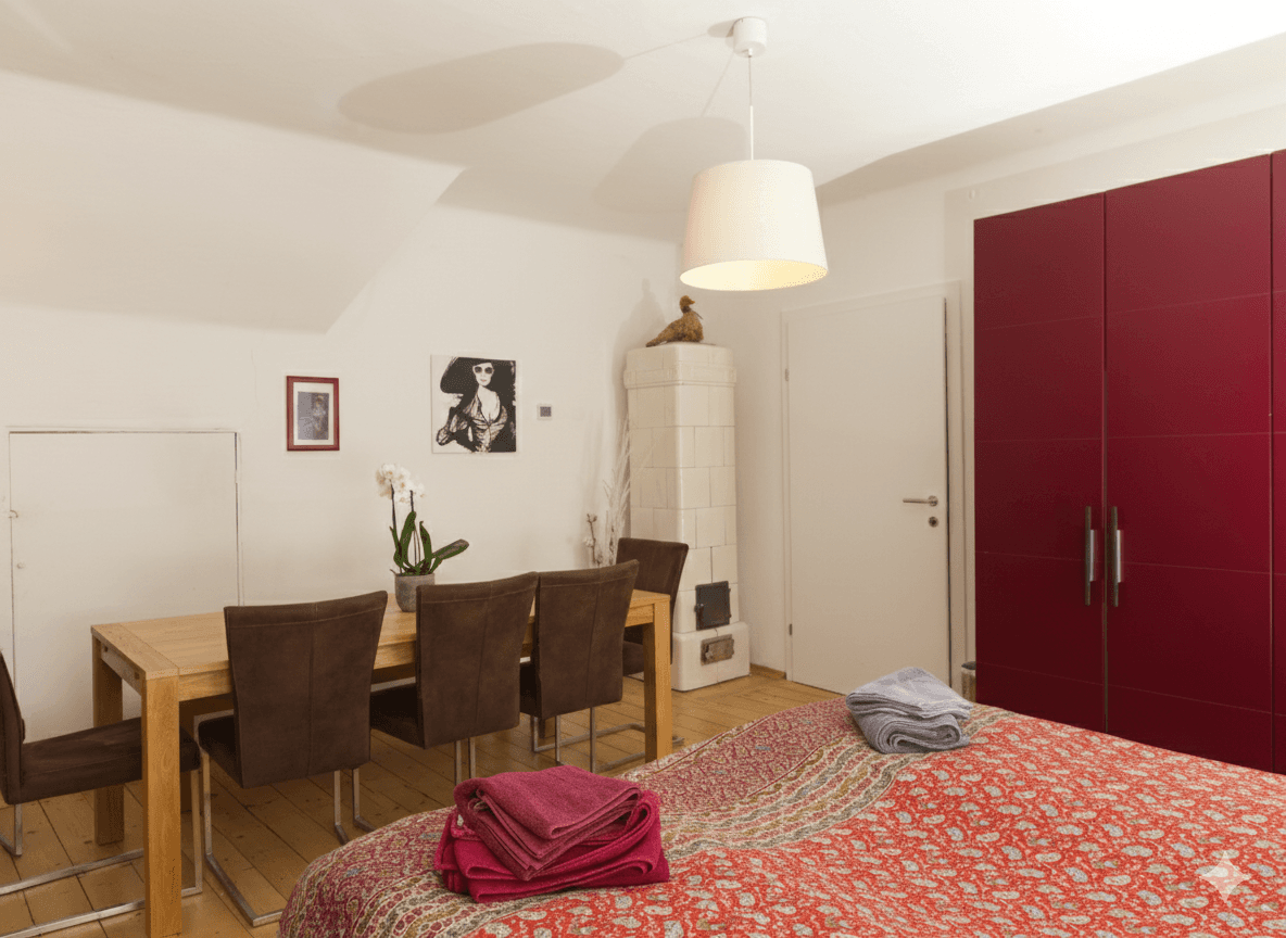 The Rose room is our premium master suite, featuring a luxurious king-size bed (180cm) dressed in high-quality linens for ultimate comfort. Wake up to stunning panoramic views of the Austrian Alps from your private east-facing balcony—perfect for morning coffee as the sun rises over the mountains. The room features beautiful natural wood flooring and exposed beams that showcase the heritage character of this 15th-century building. Dimmable lighting allows you to set the perfect mood, whether you're reading, relaxing, or winding down for the evening. With ample storage space and thoughtful design details, the Rose room combines historic charm with modern comfort. The room is light-filled and spacious, offering a peaceful retreat in the heart of Murau.